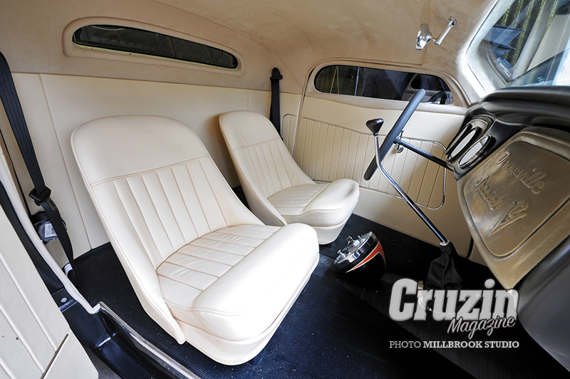 With Norm positioned so far away from the dash and vintage four spoke steering wheel, a clever idea was to house the ignition key and important switches on a headlight pod closer to his fingertips. Tom’s talent with German silver is also evident with the hand lettered glove box lid and dash facia. Manny from the Trim Shop covered the entire cockpit ensemble in rich leather, complimenting the primrose accents of the exterior very nicely.