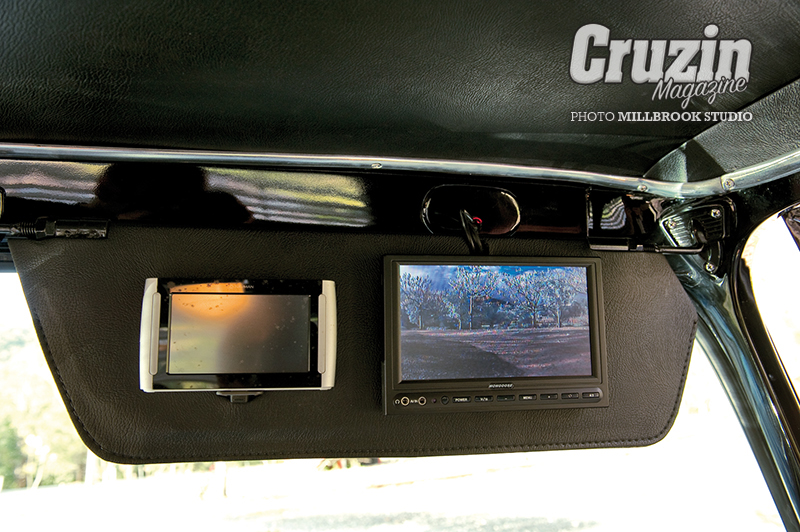 The tasteful cabin is centralised around a Glide bench seat covered in two-tone vinyl accented with red piping (by Adrian at Kool Trim). As per original, the door trims are non-existent and now feature gorgeous body colour highlighted with chrome handles and fasteners. Polished alloy step treads lead occupants inside where they are greeted by the highly detailed dash outfitted with AC, hidden digital sound, reworked original gauges, wiring and much more by the talented Ian Hardy. Sat Nav and reversing monitor are as simple as dropping the driver’s sun visor. The neat rear window venetian blind is one of Barry’s own designs, in fact he can offer custom made venetians for any car with a flat window www.carvenetianblinds.com, a sideline business for this retired gent with plenty more to offer.
