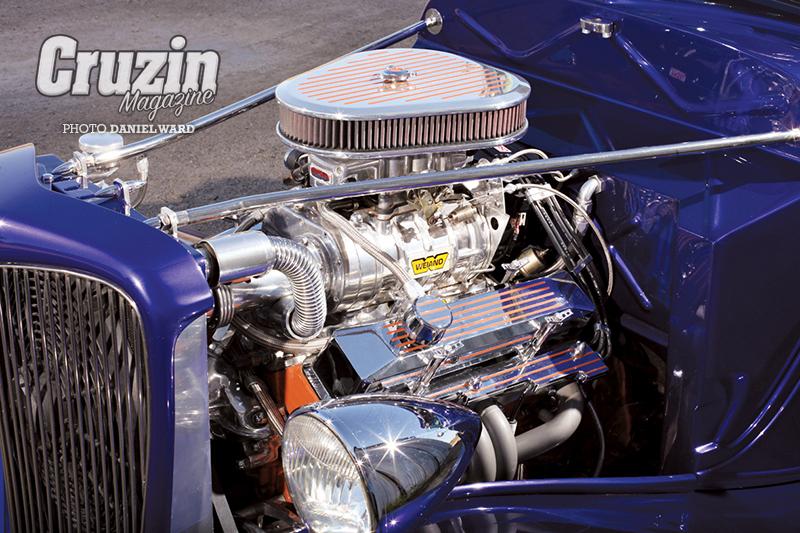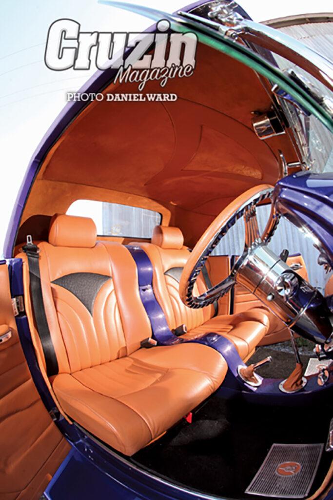 The Deuce Customs-bodied roadster was already fitted with a small block, Holden front end and white interior. The hue is as you see here, in fact the body has only been touched up in places, albeit the fenders have been freshly painted. The Sapphire colour is from a Ford Festiva and what once were green flames have now been blocked out in more sinister tones. Jeff went right through the existing HR front end adding big Brembo brakes in the process.