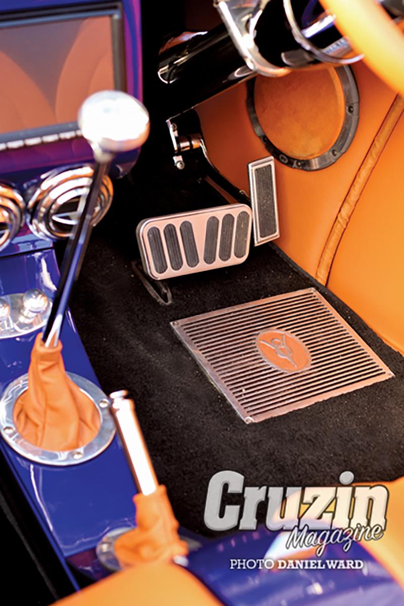 There’s plenty of bling outside to attract your attention, most notable the chrome 17” and 18” Foose wheels. The compact headlights are from Headwinds and Jeff also added the single spear billet LED tail lights, but only after Oz Rods altered the lenses to include an amber indicator. Nerf bars front and rear, wind wings and that thoughtfully rounded fuel tank with faux straps are all recent additions. The ’34 front end themed pinstripe design on the boot lid flagged the finish of the makeover.