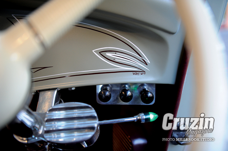Continuing the classic approach to the coupe, Dale formulated an interior design that is stunningly simple and simply stunning. When he was done crafting the bench seat he handed over the stitching duties to Pat Mesiti at Sunshine Trimmers who created an outstanding interior that pays homage to tuck ‘n roll jobs of the past. The rich ox blood vinyl and carpet ensemble is enhanced by reflected light from the perforated white hoodlining, providing a clever balance of ambiance to the confined cockpit. A Limeworks column capped with a ’40 Ford steering wheel is complemented by the matching faced gauges from Classic Instruments. The cluster of mint motor monitors are highlighted by perfect lines laid down by the super talented Doug Dorr who was visiting from the USA to take in Chopped 2013.