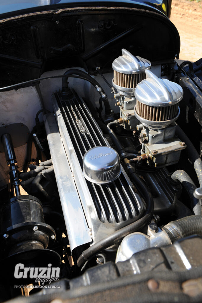 The new ‘32 chassis was constructed by Deuce Customs and comprises of fresh rails and the original Model A front and rear crossmembers. The third member is located with a pair of ’46 radius rods and suspended by a Model A spring. The hairpin-equipped front end is pinched with a gradual taper and the body is slightly channelled at the rear. 1940 Ford brake shoes and Buick brake drums are employed to halt the lightweight roadster, as best they can. Out back, the old EJ Holden diff has been replaced with a pair of ‘40 Ford bells enveloping a quickchange centre to further enhance the traditional approach to the rebuild. “I did have an 8BA flatty to drop in but just couldn’t do it,” Dylan says with a wince.