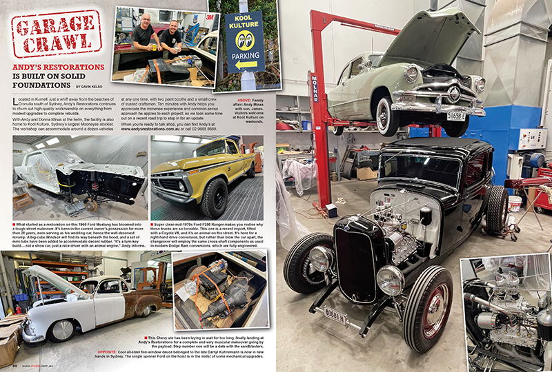 We would have loved to be at the Grand National Roadster Show earlier this year to check out the Street Machines; Then and Now, but thankfully Stephan Szantai has provided us with some awesome pics from this flashback to the Pro-Street era. Just for fun we head to Armidale in NSW for the New England Rod and Custom Run, and then to Sydney for Letterheads, an unique gathering of pinstripers and signwriters. Before we left town, we dropped in at Andy’s Restorations for a ten-minute tour.