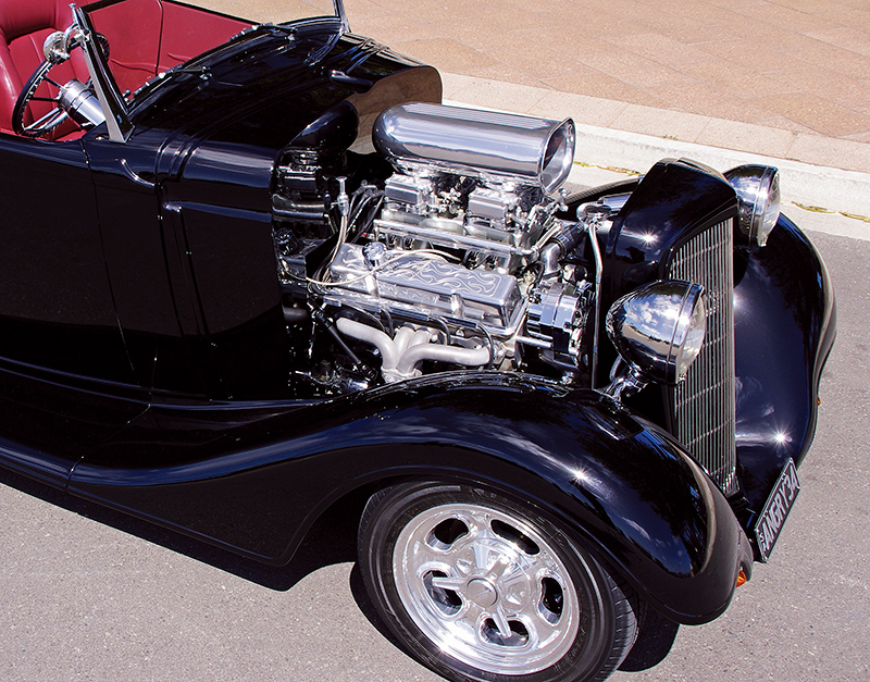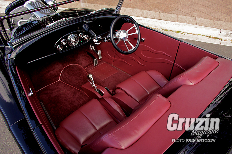Glistening like an onyx jewel in sunlight, the roadster was in need of some fine threads to complement the freshly painted exterior. Luckily for Mark, his cousin Dave Jury is a dab hand at motor trimming and was eager to put his hand up and pitch in. Operating under his part time business banner of Fleurieu Auto Upholstery, Dave assisted his cousin to complete the unique interior suitable for year round top down cruising. From owner constructed wraparound seat cove, dickie seat and console to the intricate crafted flame door cards, Dave stepped up and stitched together miles of water resistant leatherette in a palette resembling that of burgundy wine with claret toned carpet. Visual highlights are executed with a billet column, steering wheel, pedals, gauge bezels and a neat skull topped B&M shifter. Chopped and chromed owner fabricated windscreen complete the interior package.