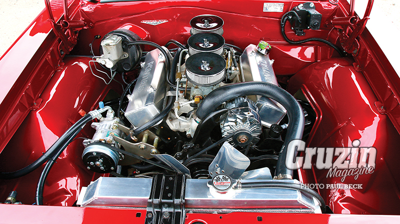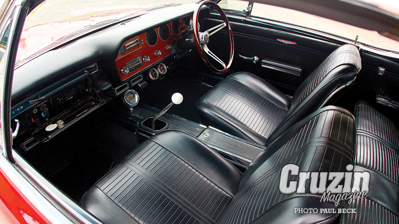DA Motor Trimming restored the bucket seats, aside from fresh door cards, carpet and headliner, the remainder of the black vinyl interior is original. Frank found a plaque that said ‘Ray Morris Motors’ completed the RHD conversion in the 1960s, but by now, the dash fascia was ‘a piece of crap’ in Frank’s terms. They re-laminated it, finishing off with half a dozen coats of lacquer. The Grant wood grain steering wheel seems right at home, and so as not to clutter the sixties cockpit, the stereo and Vintage Air Gen-II AC controls are hiding in the glove compartment.