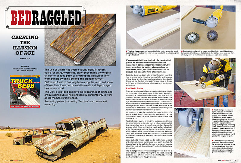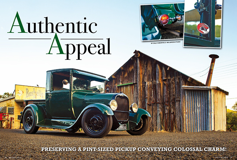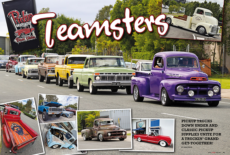But that’s not all (and never will be!). How about a four-cylinder Mercuirser-powered Model A closed cab, a home-brew Hemi-powered ’44 Ford pickup, and one very classy ’54 Chevy. We also spotlight a ’39 Willys gasser from the past, check out the truckin stars of the Grand National Roadster Show in the USA, and head to an Aussie pickup round-up on the Queensland Sunshine Coast. There is a little tech in this issue as well, with some tips and tricks on aging timber for your pickup bed.