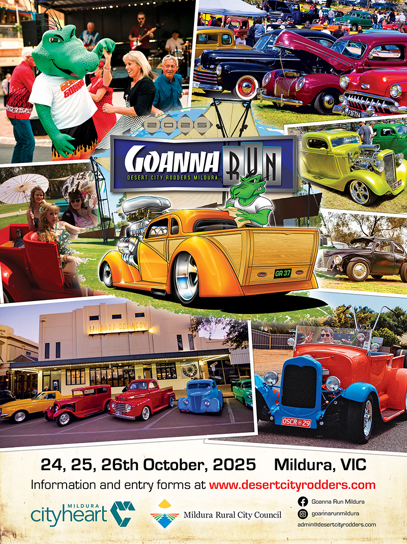 The Desert City Rodders are very thankful to anyone who attends their annual Goanna Run, after all, it’s a long way! Based in Mildura, it’s around a six-hour haul from Melbourne, or close to five hours from Adelaide, so depending on your starting point, you’re well and truly ready for a sip once you arrive. Fortunately, the host club is ready to accommodate, with hot food and cold bevvys for the Friday night meet and greet.