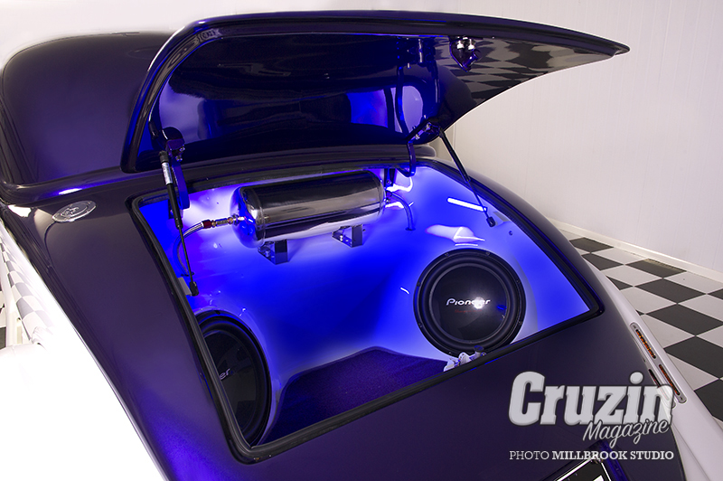 “I watched Pimp My Ride one day, where they put these huge speakers in the boot of a car, and I thought Mmm, I like that. I went out and bought bigger speakers than what I had and boxed out the boot because I still had access from the front. My hot rod friends just called me a dickhead, and they still give me grief to this day. They said, ‘Where are you going to put all your stuff?’ I just said, take less. The blue lights were shown to me by a mate, and I just had to have them.”