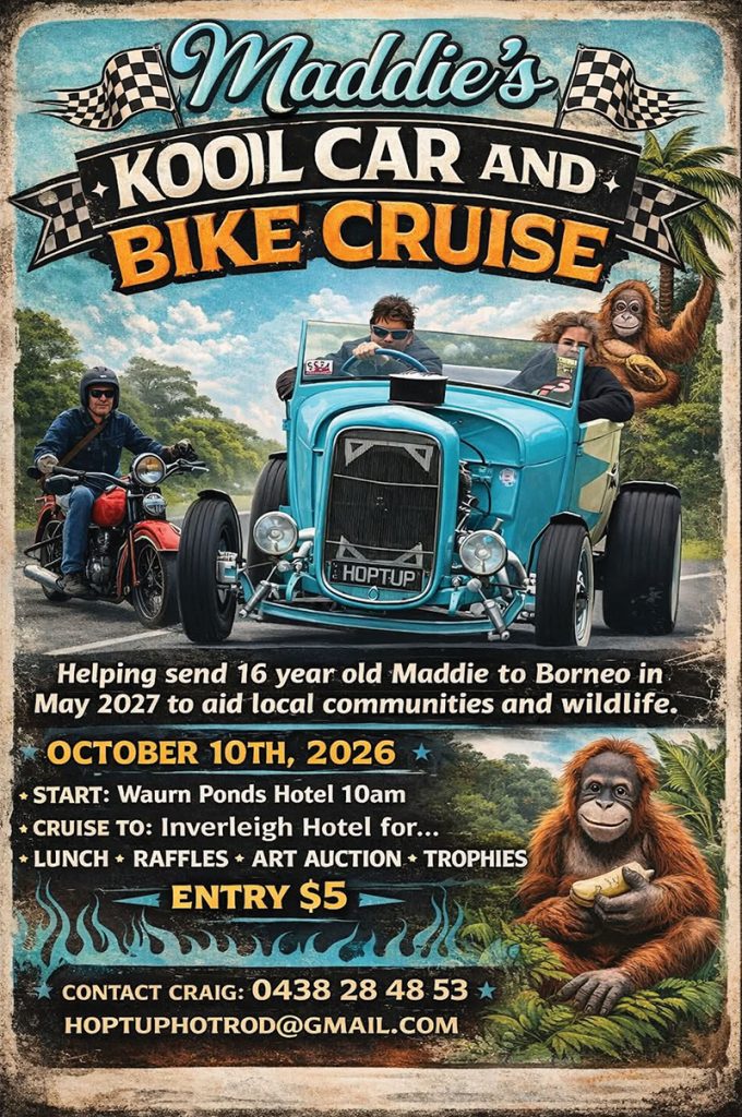 Bring your best wheels on the day, but if you’re keen to support the event with a small contribution, reach out to Craig Issel on 0438 28 48 53 or hoptuphotrod@gmail.com