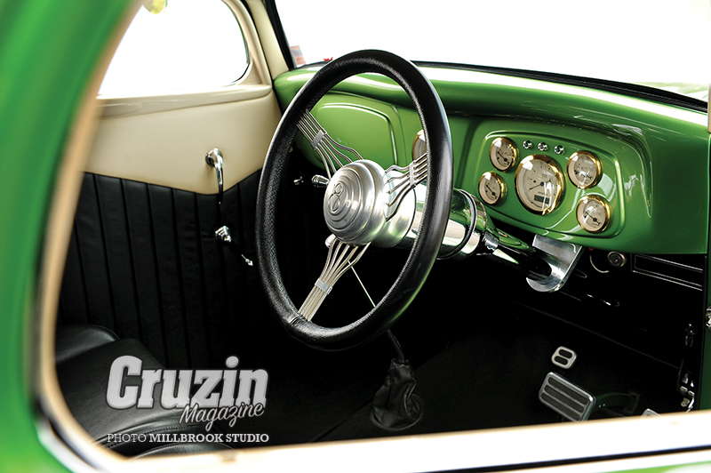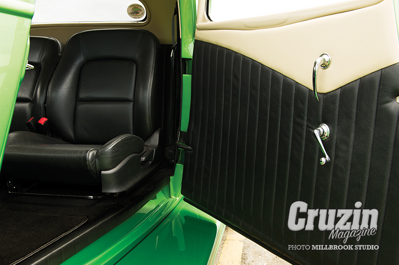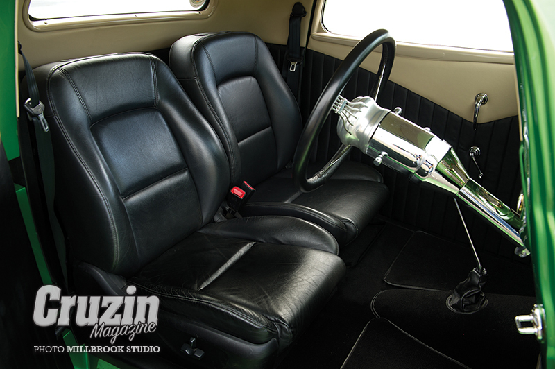 The rest of the interior was completed by Warrick Briggs at Ideal Auto Upholstery in black leather with contrasting tan. Mercedes-Benz quality cut-pile carpet adds refinement, while highlights include an Ididit column with banjo wheel, Lokar shifter and pedals, repro handles and winders, and gold-faced Dolphin gauges.